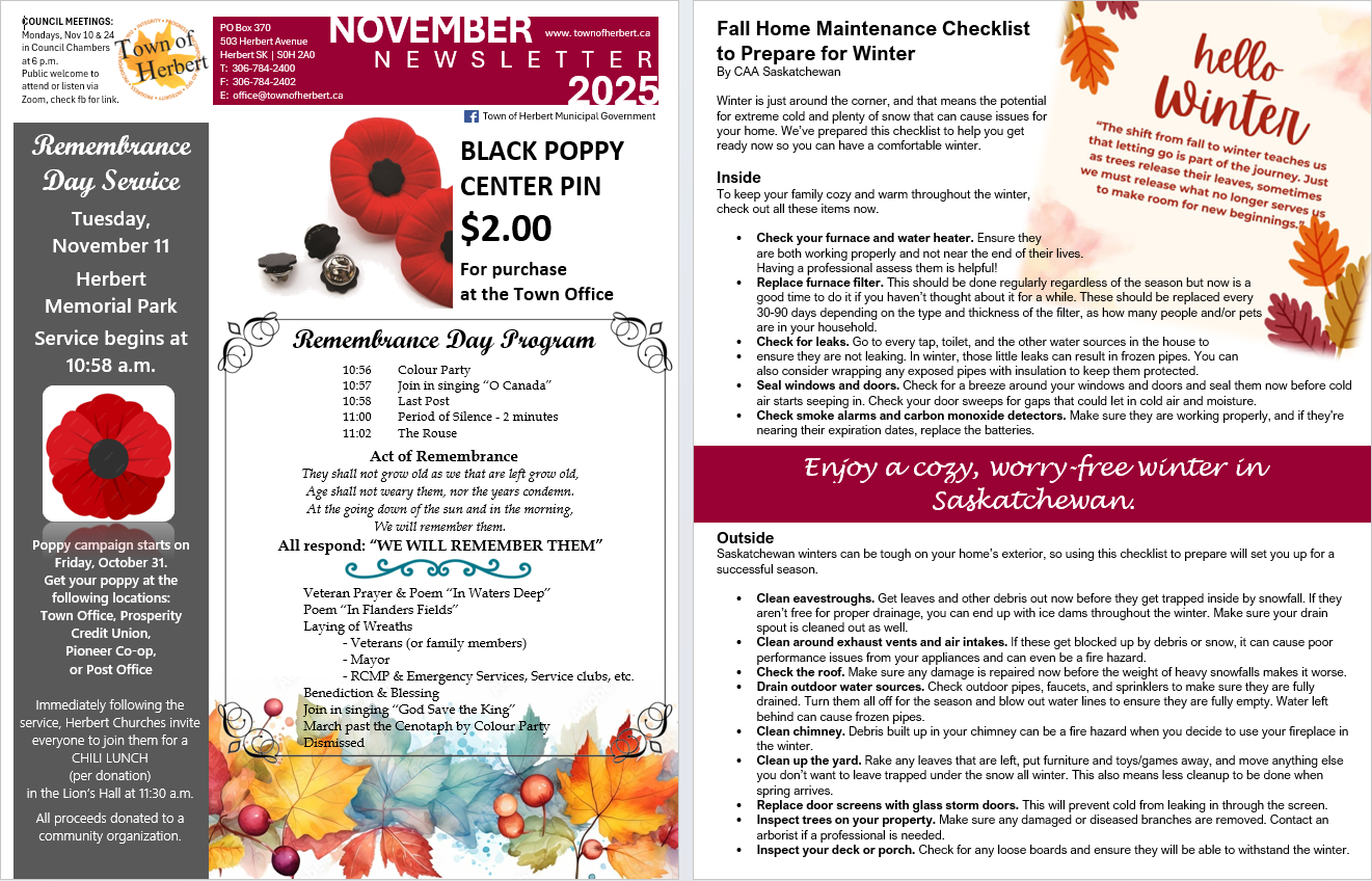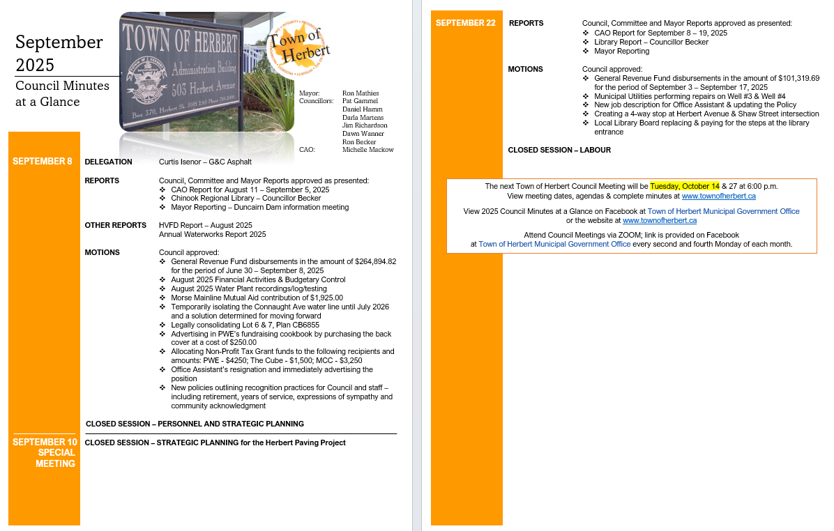 Council meetings are held in the Town Office Council Chambers beginning at 6:00 p.m. The public is welcome to attend. Enter the building from the back door off of the Town Office parking lot. You can also listen in on the discussion via zoom. The zoom link is shared on the Town of Herbert's Municipal Government Office Facebook page on the day of the meeting. More