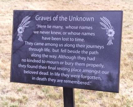 In 1988 and 1989, Merle Harrison, as assistant administrator, with a survey crew of Murray Harrison and Ernest Zander, surveyed the total cemetery to update for posterity, the unmarked sites and the actual burial sites, which differs in many instances from the register. All the information was documented and the map was put in book form for easy access.